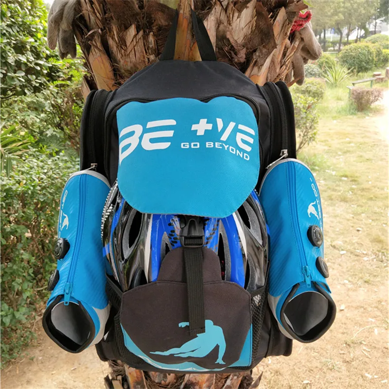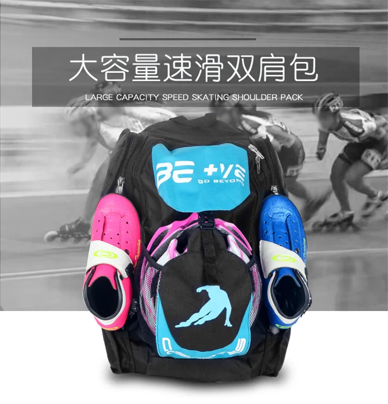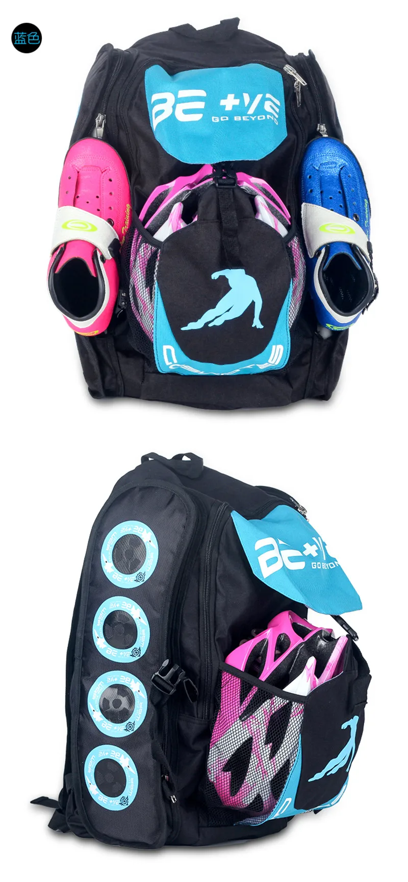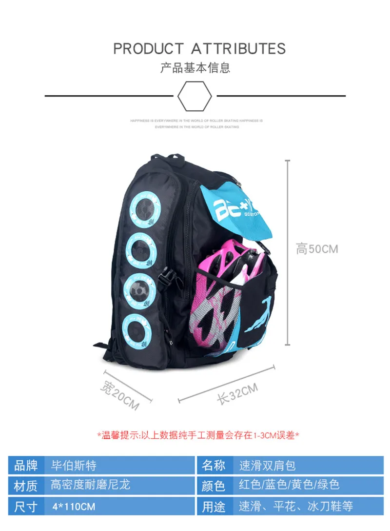 this speed skates backpack can hold 4X110mm speed skates shoes and helmet and protective pads; it is made of good nylon material, with breathable experience and heavy carry system; you can choose red / yellow / blue / green color; the size is 52cm*32cm*20cm;